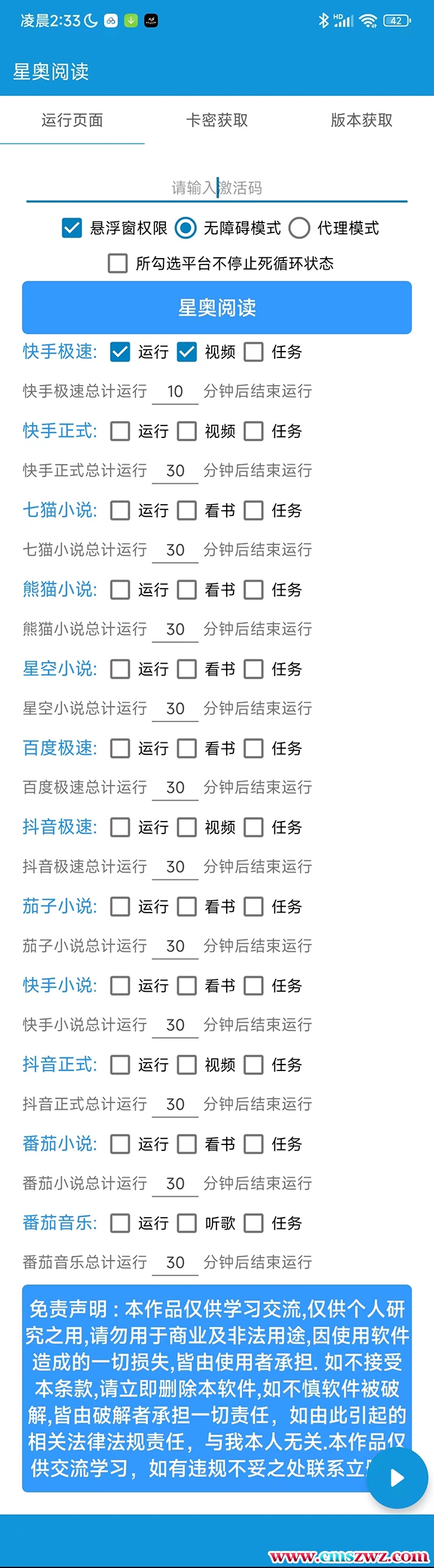 星奥阅读这款软件支持快手极速、快手正式、七猫小说、熊猫小说、星空小说、百度极速、抖音极速、茄子小说、快手小说、抖音正式、番茄小说、番茄音乐等多个平台,助手执行全自动挂机刷金币,开宝箱,看广告任务,单机多平台运行一天10-20+。