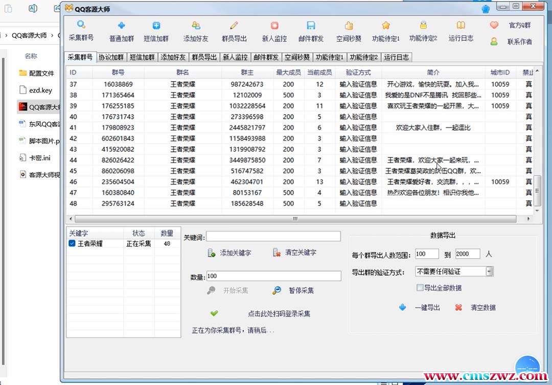 支持一键采集免验证群、协议加群、qq添加好友、群成员导出等多种功能