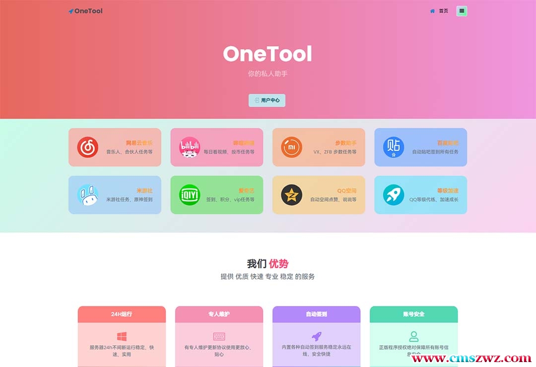 2023最新OneTool多平台助手程序源码+视频教程OneTool 是一款功能强大的多平台助手,目前最新版本为 199911 (1.9.1)。除此之外,该应用程序还拥有其他好玩的功能,等着您们来搭建测试。可以帮助用户快速完成各种任务。例如网易云音乐每日签到、每日云贝、打卡 300 首歌曲、音乐人每日任务等;WX 运动健身记步范围设定, QQ 空间秒赞秒评;哔哩哔哩视频短片每日签到、每日在线观看、