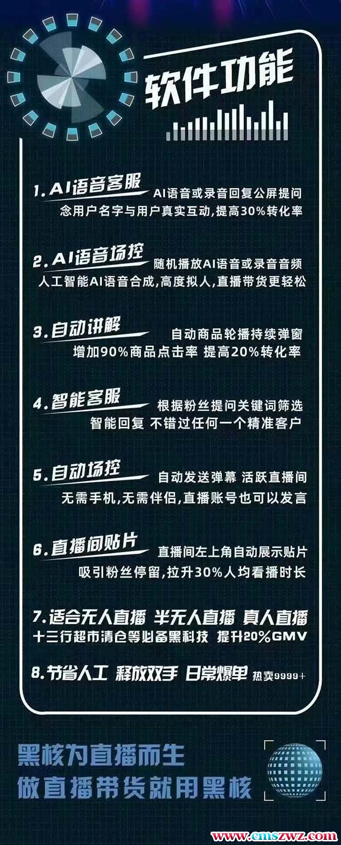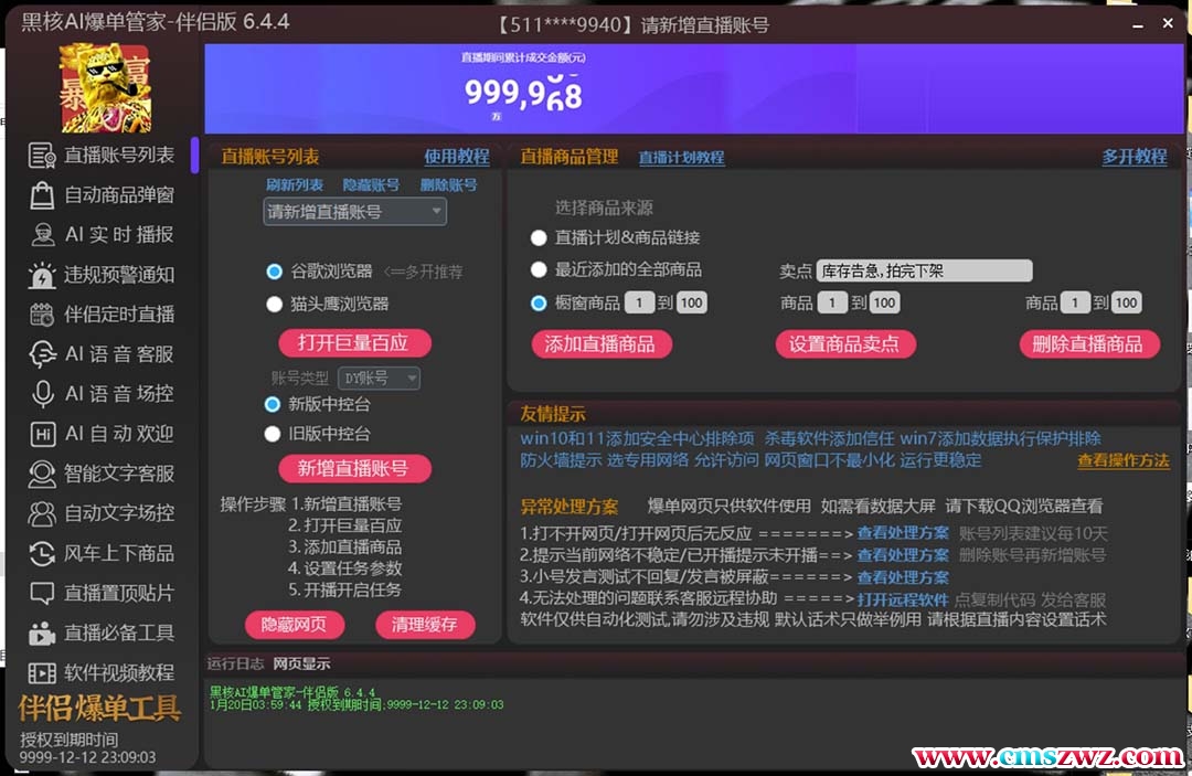 黑核AI爆单管家——支持抖音橱窗版、抖音团购版、海外Tiktok版支持多开,自动商品弹窗和排序,AI 语音(客服、场控、自动欢迎)智能文字客服,自动文字场控 ,自动上下商品,直播置顶贴片编辑话术和导出导入 !设备需求:电脑本脚本卡密需要另外购买,几块钱一个,介意请移步到不需要卡密的项目