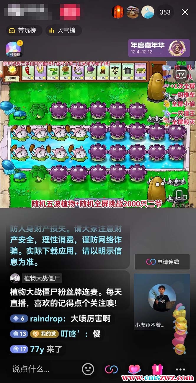 这种直播玩法很容易吸引人,互动能力非常强,撸礼物效果非常好,在播的主播基本每天都有1000+的收入,有电脑,会玩植物大战僵尸就行,感兴趣的建议不要错过