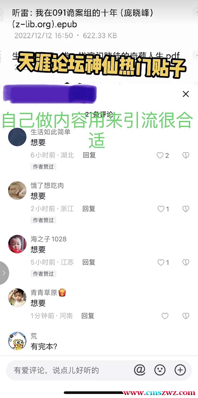 天涯论坛以前那些令人印象深刻的帖子鬼故事、猎奇、奇遇、各行业从业经验等用处:1、可以自己看看,满足猎奇心理2、把里面的内容拿来发在各平台,拿来引流,效果很好引流过来后变现其他产品3、引流过来后卖这个资源合集,客单价10~30¥,每天日入几百,比较轻松。收入不多,比不上那些大项目,但是也还可以发布平台参考:抖音、快手、小红书、知乎玩法很多,项目虽小众,主要看玩法你也可以创新别的玩法1、在电脑上把压缩