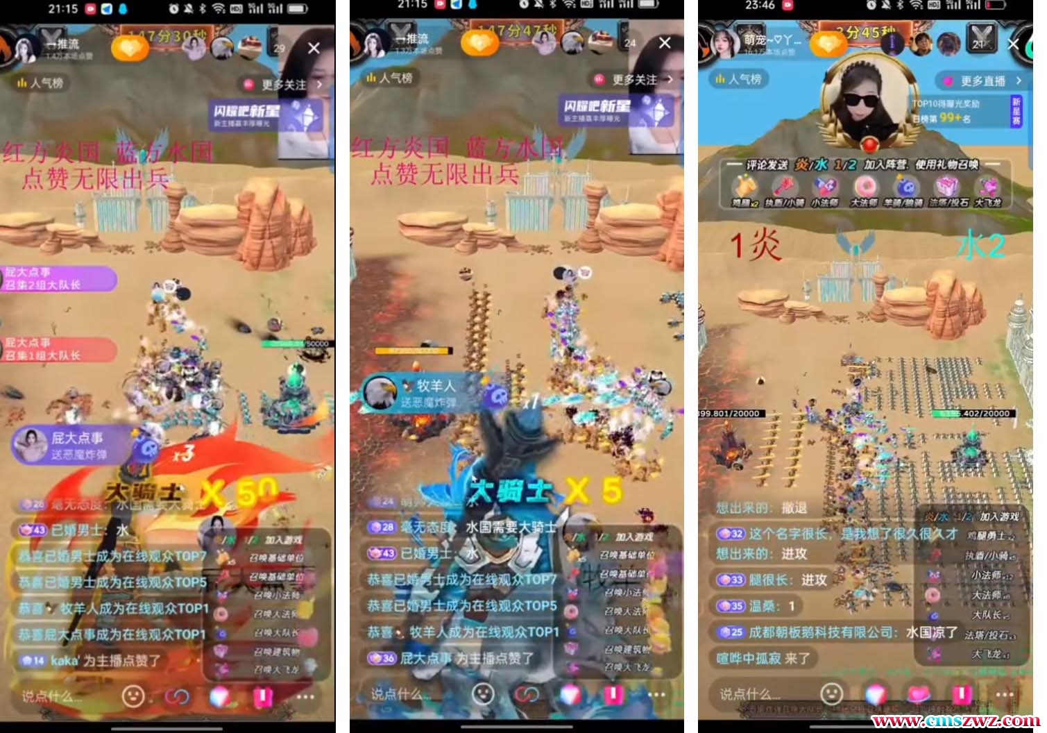 观众输入【炎】【1】或【水】【2】后会自动生成一个基础军队,通过点赞、评论、礼物进行战前军队部署。可以通过【进攻】【撤退】进行部队的控制,通过实时的操作,极限消耗对方阵营的兵力。游戏正上方为攻守方识别,游戏开始时,系统随机分配炎国、水国为进攻防守方。在规定时间内,进攻方未攻下防守方,则攻守方进行转换;若攻守方转换后,攻方未进攻下守方,则守方获得胜利。