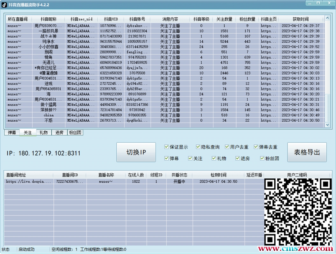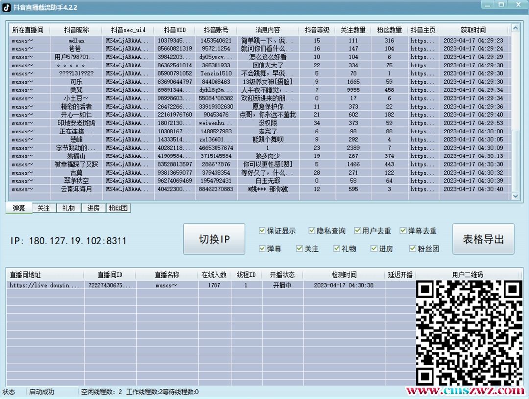 抖音任意直播间采集实时弹幕信息,弹幕用自己抖音扫码直接可私信对方,支持自定义筛查,弹幕导出数据。