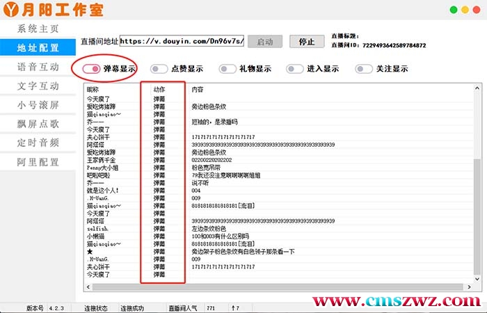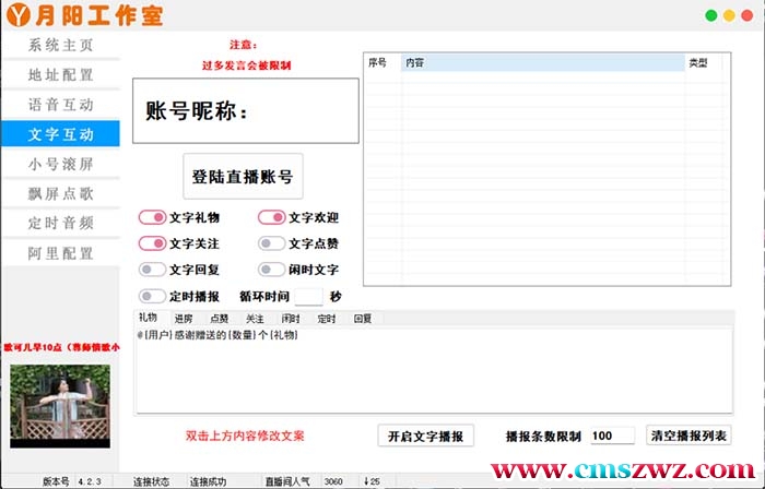 更多功能:支持读取直播间弹幕信息,支持语音回复,送礼物回复,小号滚屏,文字互动,以上可以自行设置。
