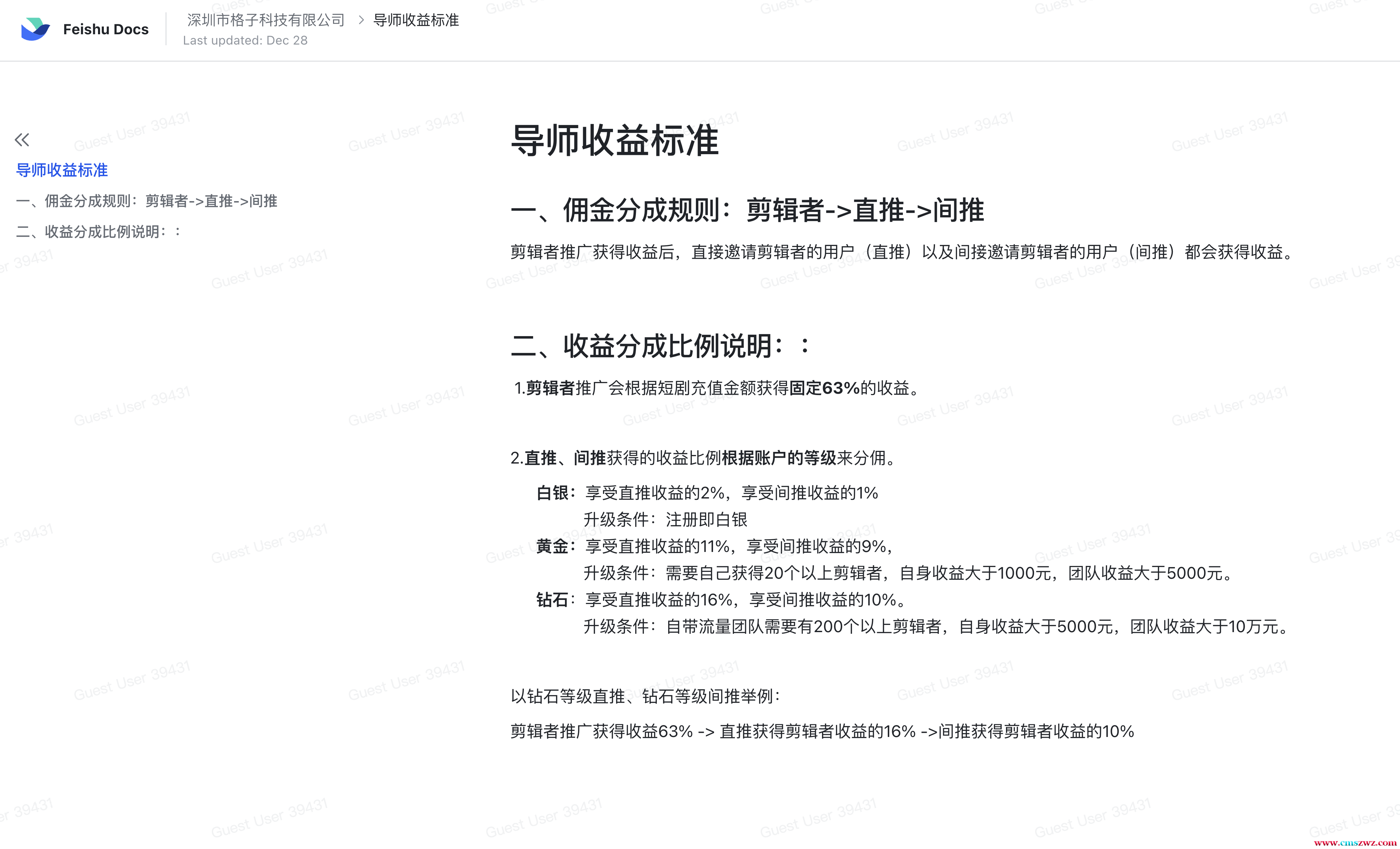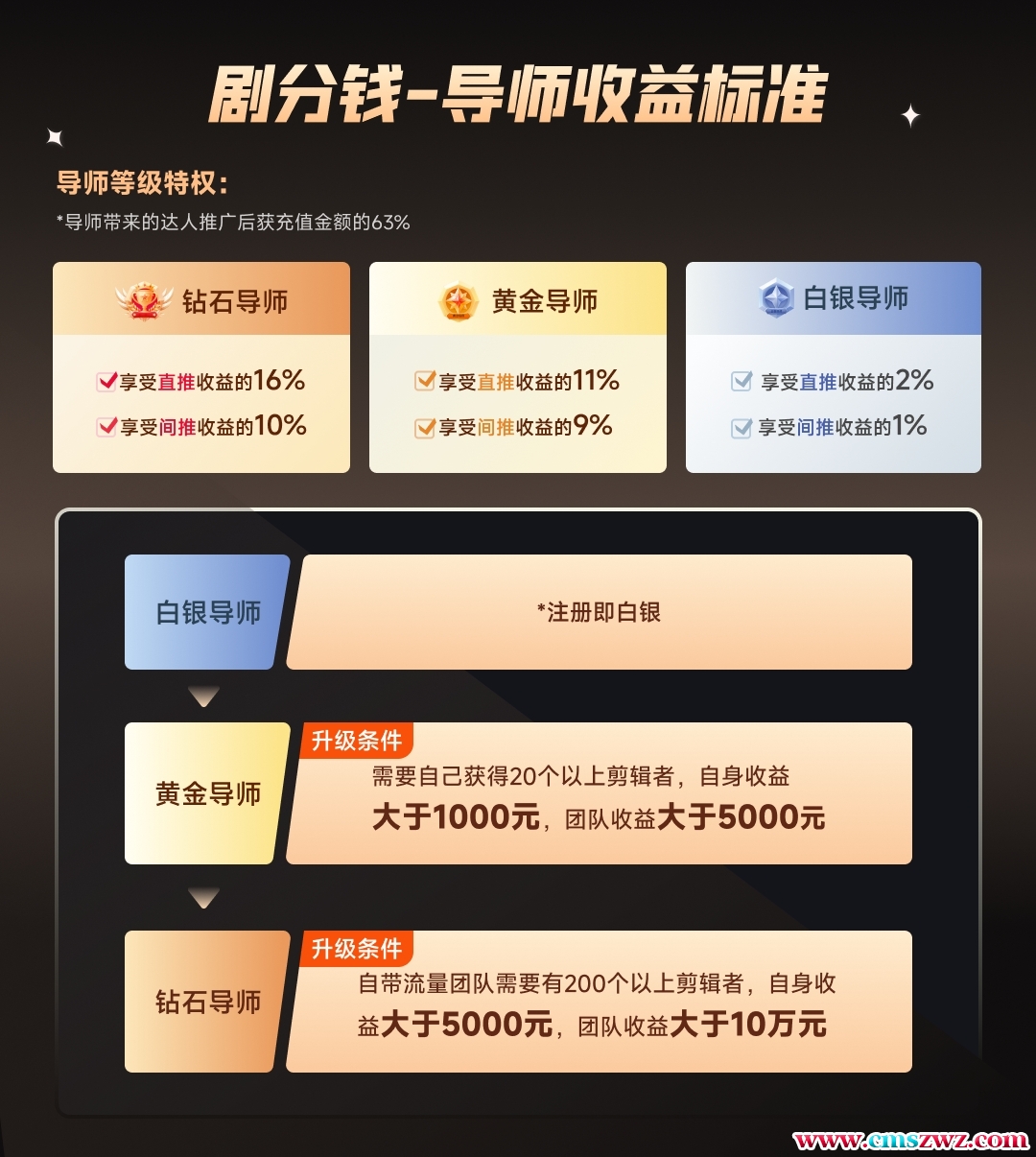 剧分钱(公众号) 提供资源: 最新热门短剧CPS推广项目,提供40个热门剧场/5000部短剧授权支持视频号/快手/抖音小程序挂载推广,全网置顶分佣。 寻求渠道: 寻找短视频切片/影视切片/直播切片达人/分销代理/带队团长副业导师一起赚钱 什么是短剧? 短剧是指单集时长在5分钟以内,且剧情连续、剧集较多的竖屏视频,是一种介于电影和小说之间的视频形态。 什么是短剧CPS? 短剧CPS又叫短剧分销,也叫作短视频挂载,视频平台会根据你推广的短剧产生的收益,按一定比例获得佣金。 导师/代理收益标准 一、佣金分成规则:剪辑者->直推->间推剪辑者推广获得收益后,直接邀请剪辑者的用户(直推)以及间接邀请剪辑者的用户(间推)都会获得收益。 二、收益分成比例说明: 1.剪辑者推广会根据短剧充值金额获得固定63%的收益。 白银:享受直推收益的2%,享受间推收益的1%,升级条件:注册即白银 黄金:享受直推收益的11%,享受间推收益的9%,升级条件:需要自己获得20个以上剪辑者,自身收益大于1000元,团队收益大于5000元。 钻石:享受直推收益的16%,享受间推收益的10%,升级条件:自带流量团队需要有200个以上剪辑者,自身收益大于5000元,团队收益大于10万元。 以钻石举例: 剪辑者推广获得收益63% -> 直推获得剪辑者收益的16% ->间推获得剪辑者收益的10% 5000部短剧列表(包含所有完整版短剧)、新手指导教程都放到网盘里面了,可供下载