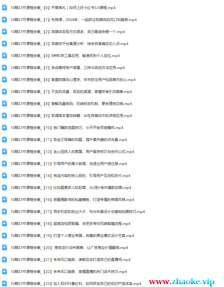 └──10期23节课程合集_【9】获得降本增效神器,AI在自媒体中的详细应用.mp4 76.20M├──10期23节课程合集_【10】独门爆款选题技巧,今天开始灵感爆炸.mp4 143.06M