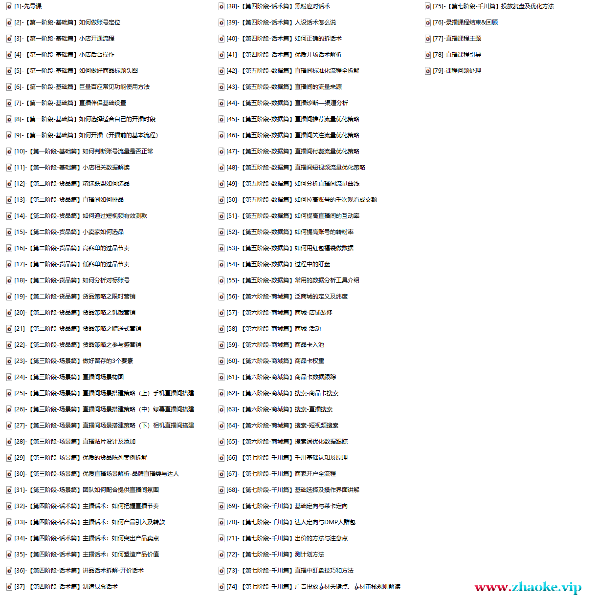└──[9]-【第一阶段-基础篇】如何开播(开播前的基本流程).mp4 124.43M├──[10]-【第一阶段-基础篇】如何判断账号流量是否正常.mp4 160.55M