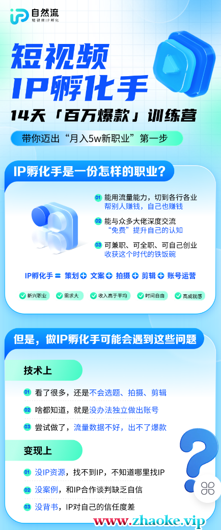 课程来自自然流的短视频IP孵化手【第九期】,14天线上实战训练营。理论+实操,努力跟课14天,学完就能掌握。个人IP的影响力大小,取决于孵化手的能力,行业会过时,行业+IP孵化手不会过时。用流量能力,铸就属于自己的铁饭碗。