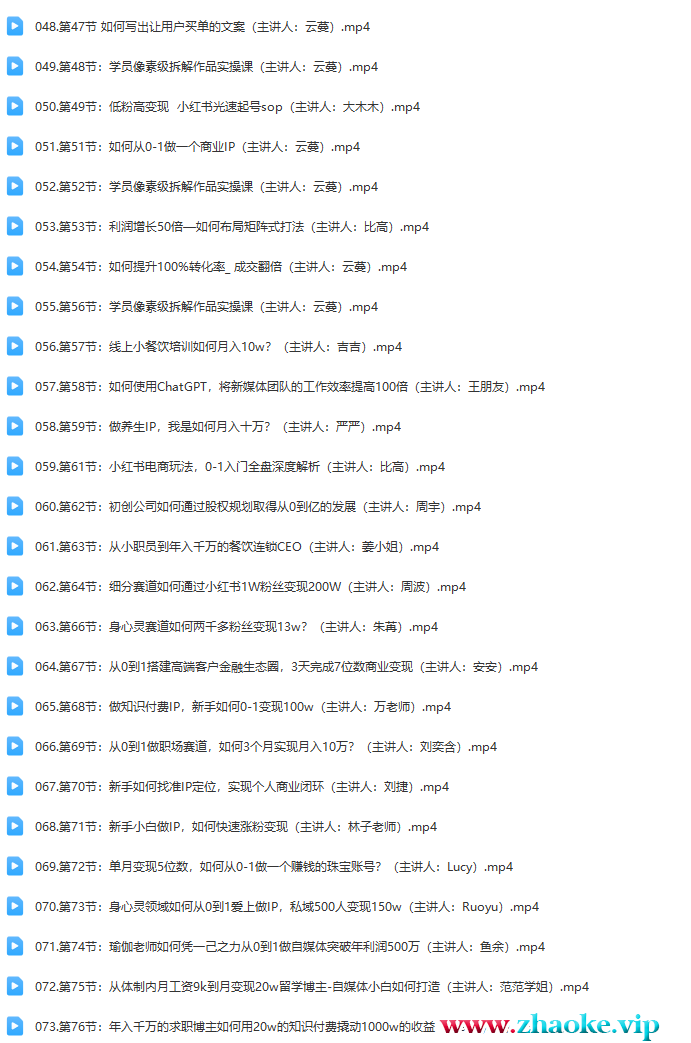 └──073.第76节:年入千万的求职博主如何用20w的知识付费撬动1000w的收益(Mengying).mp4 332.62M├──005.第77节:直播带货一年收入1000w:直播政策日渐收紧,新手小白如何破圈(主讲人:婉婉).mp4 371.95M