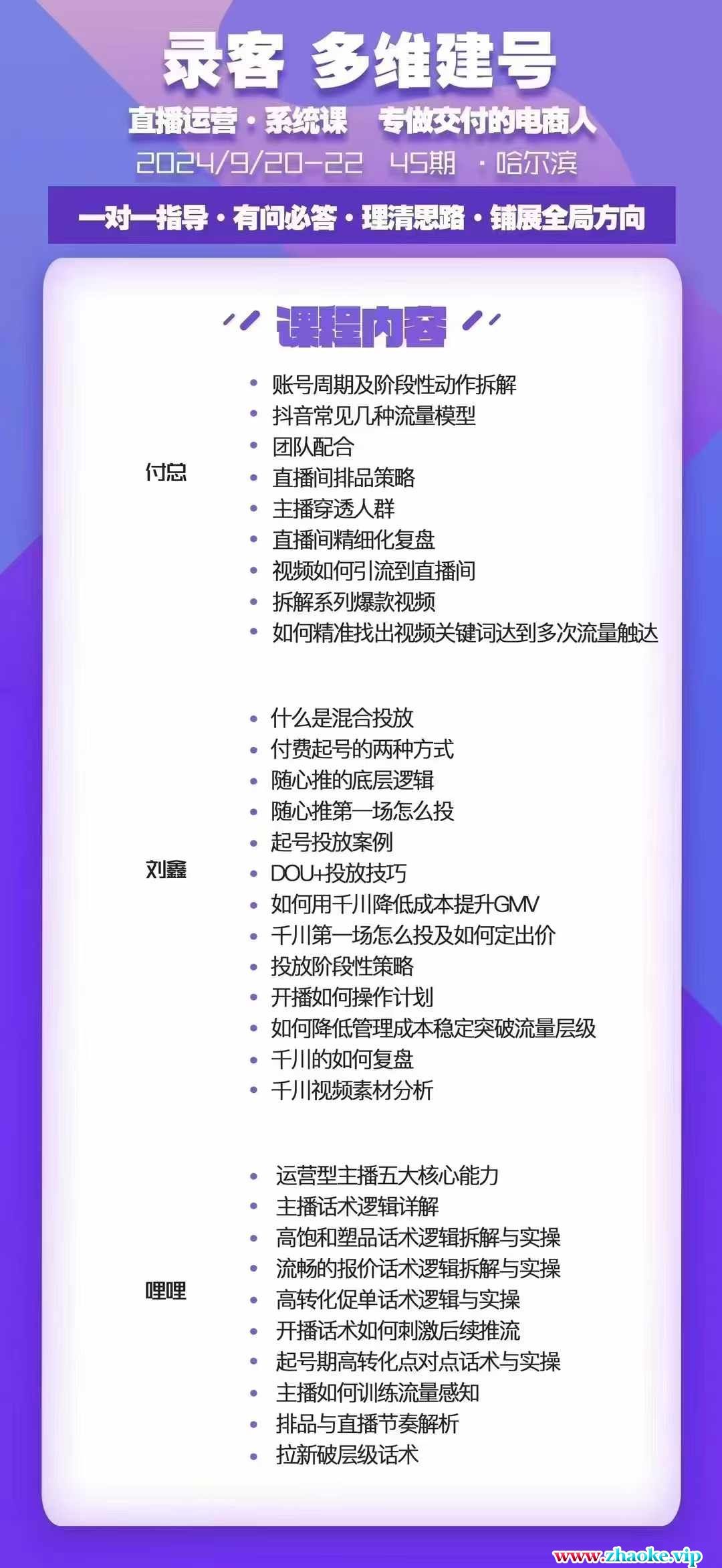 课程简介:录客传媒大果-哈尔滨第45期线下课9月20-22号(价值12800元)大果-45期线下高清视频。抖音多维建号、起号方式与复盘、运营型主播、付费混合投放、短视频流量叠爆。站长强烈推荐!!!课程