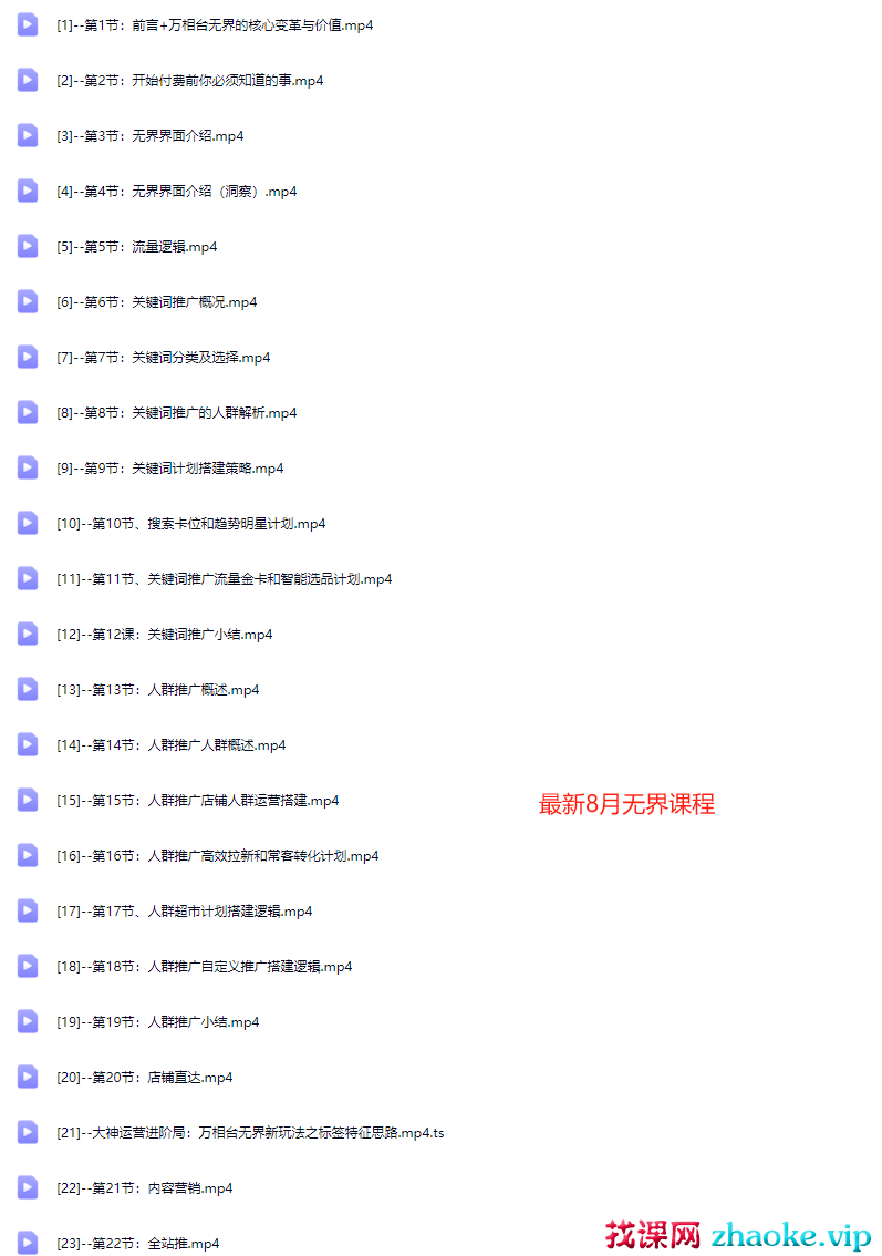 课程简介:25年8月无界新课!!无界推广全链路实操,从算法认知到爆单策略,中小商家低成本引爆精准流量!课程目录: