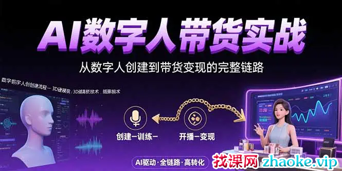 本课程是AI数字人带货全流程实战教程,系统讲解从数字人创建到带货变现的完整链路。课程涵盖数字人形象/音频录制、视频生成技术、热门声音/形象借用、账号冷启动、橱窗开通、选品对标、AI文案生成、视频剪辑优
