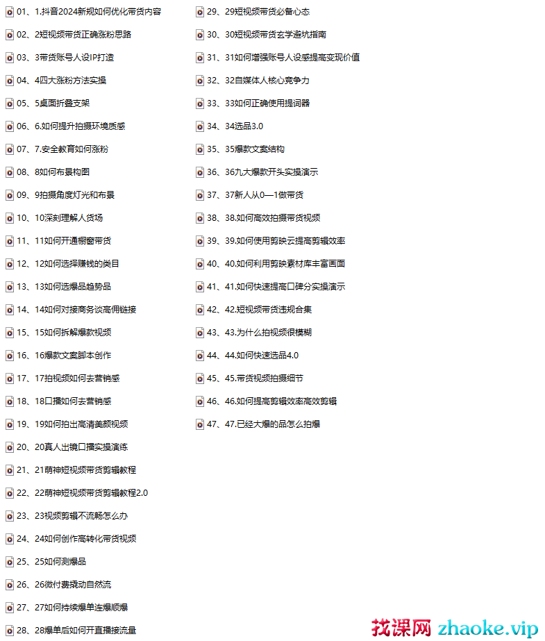 课程简介:萌神个人IP短视频带货新人系统实操课适合新手小白从0到1系统性学习做有个人ip属性的带货账号课程目录: