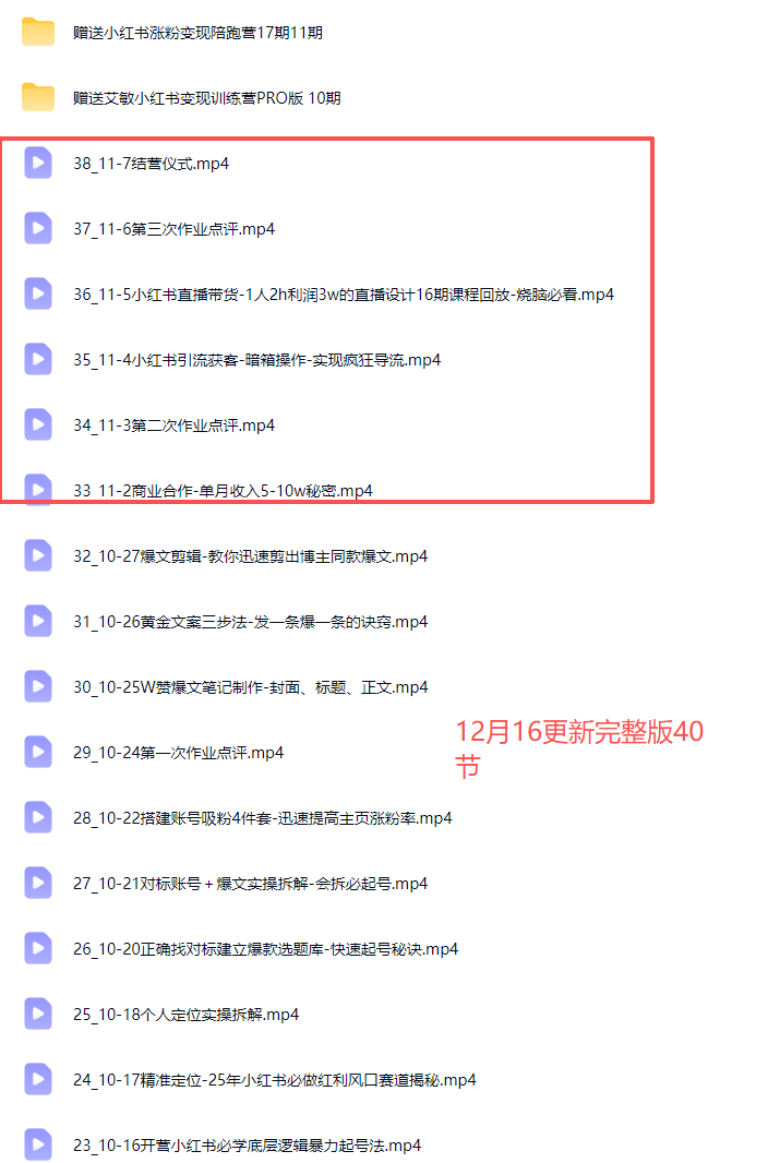 课程简介:#12月16更新完整版40节全网最新小红书课程!!!!带你从0到1做一个高变现的小红书博主视频截图:课程目录: