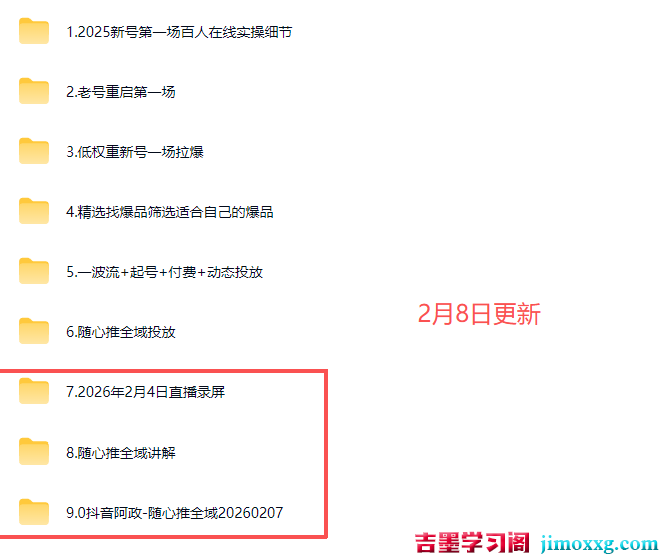 课程简介:#2月8日更新:抖音阿政-随心推全域20260207自然流微付费,内容很全,适合想提升直播运营、短视频、带货、投放的朋友课程讲自然流、微付费、全域投放、小圈子直播,实操讲解,细节满满,适合新