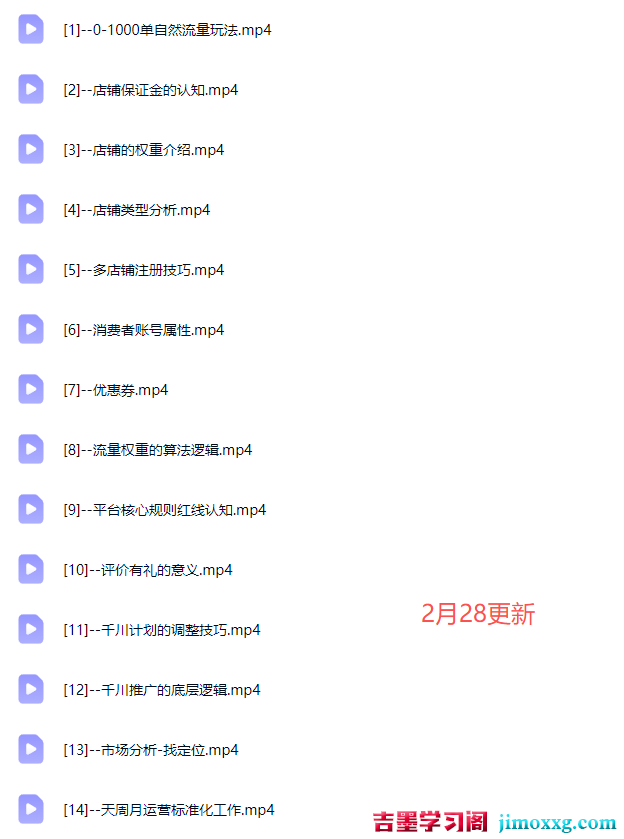 课程简介:14节课,涵盖抖音店铺权重、自然流,千川打法课程目录: