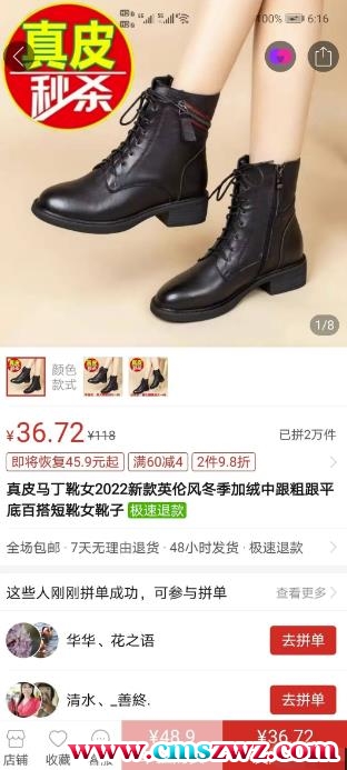 视频号小店的一款马丁靴售价203,去拼多多拿货价格36.同一个厂家生产的靴子。