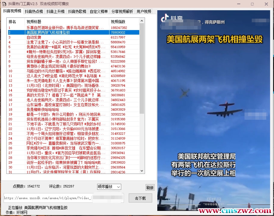 增加单个视频全屏播放(右键视频区域---缩放---全屏或双击视频区域)增加查看作者全部作品以及作品信息增加查看播放视频时作者信息抖音视频榜单抖音热点榜单视频解析 批量下载