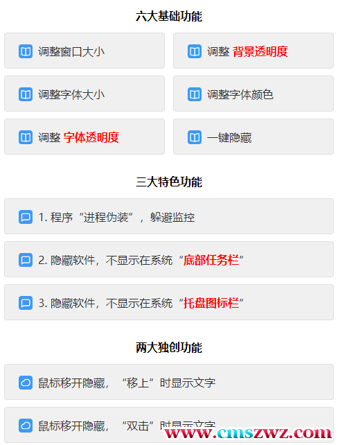 六大基础功能调整窗口大小 调整背景透明度调整字体大小 调整字体颜色调整字体透明度 —键隐藏三大特色功能1.程序“进程伪装”,躲避监控⒉.隐藏软件,不显示在系统“底部任务栏"3.隐藏软件,不显示在系统“托盘图标栏”两大独创功能鼠标移开隐藏,“移上”时显示文字鼠标移开隐藏,“双击”时显示文字