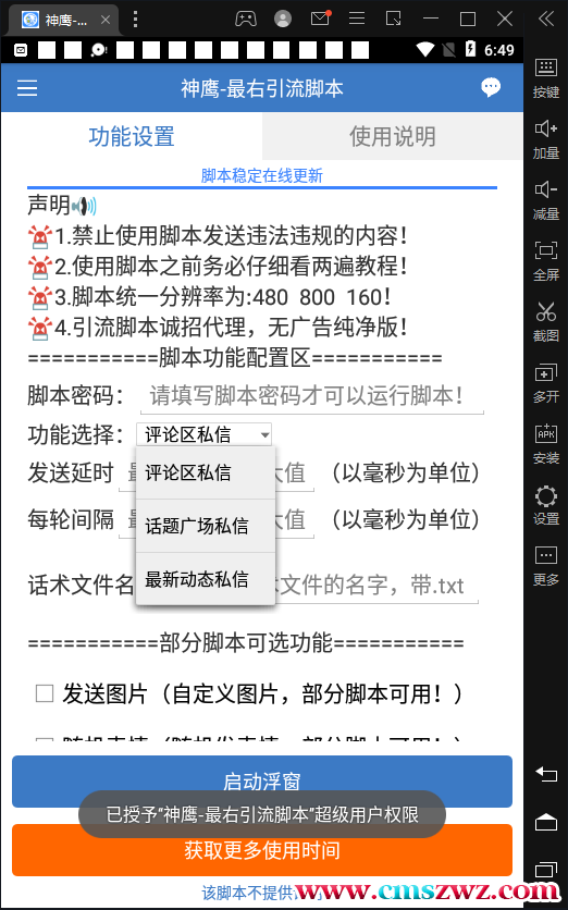 神鹰最右引流:神鹰系列-傲气神鹰,谁与争锋。进入话题广场,选择好一个人数较多,或者与推广相关的话题,进入后,开启脚本。脚本软件自动关注并且私信,进入评论区开启脚本自动私法引流话术信息,达到精准引流的效果。设备需求:电脑模拟器本脚本需要另外购买卡密,几块钱一个,介意的请移步到不需要卡密的项目