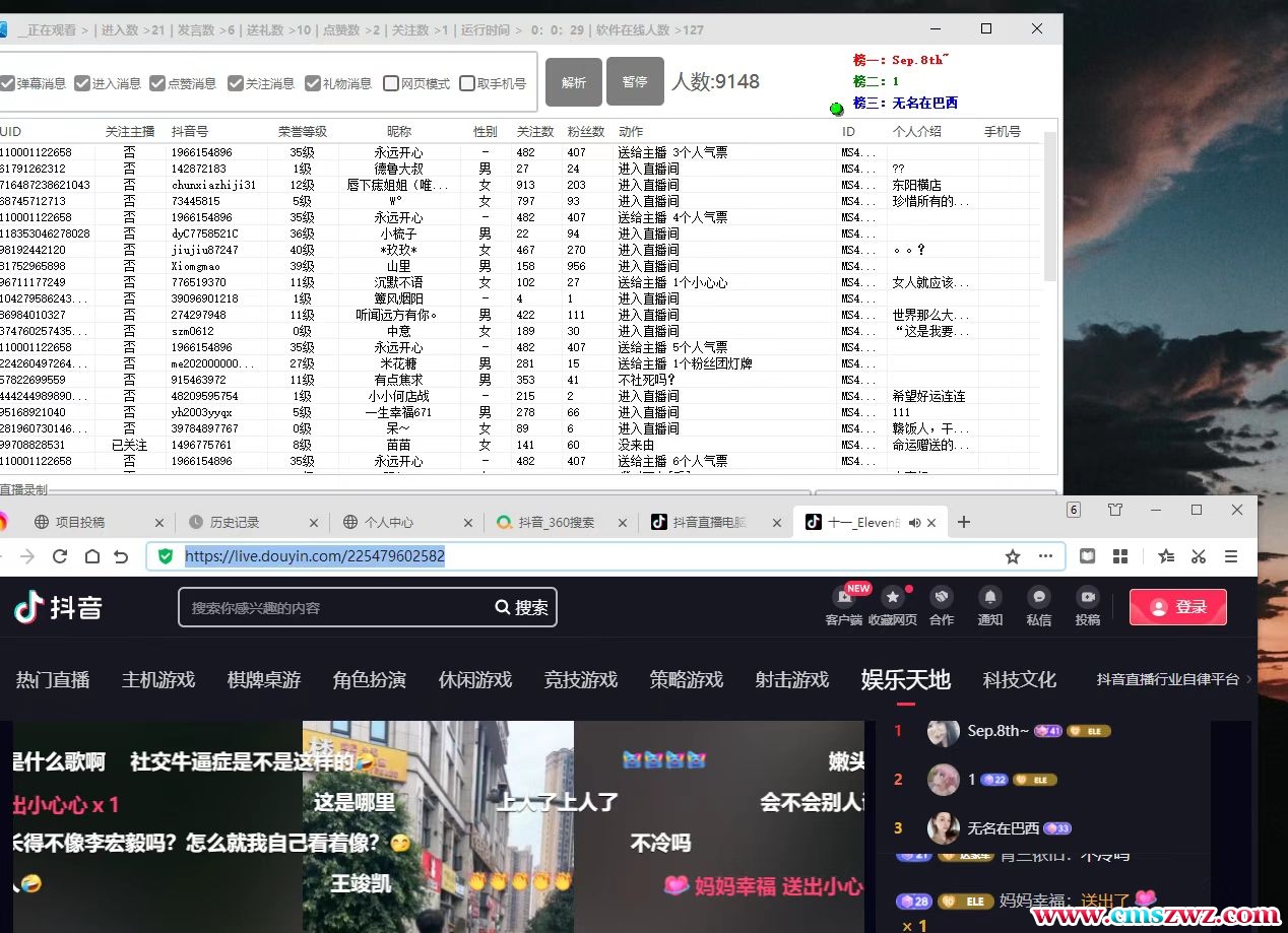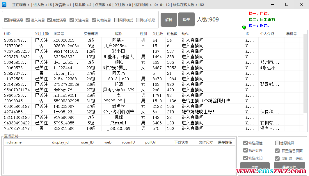 2023年02月10更新闲鱼卖998的抖音直播采集脚本采集任意直播间采集发言,送礼,点赞,关注用自己抖音扫码直接可私信对方采集出来的数据支持一键导出,采集出来的数据导出execl本脚本需要另外购买卡密,几块钱一个,介意的请移步到不需要卡密的项目设备需求:电脑