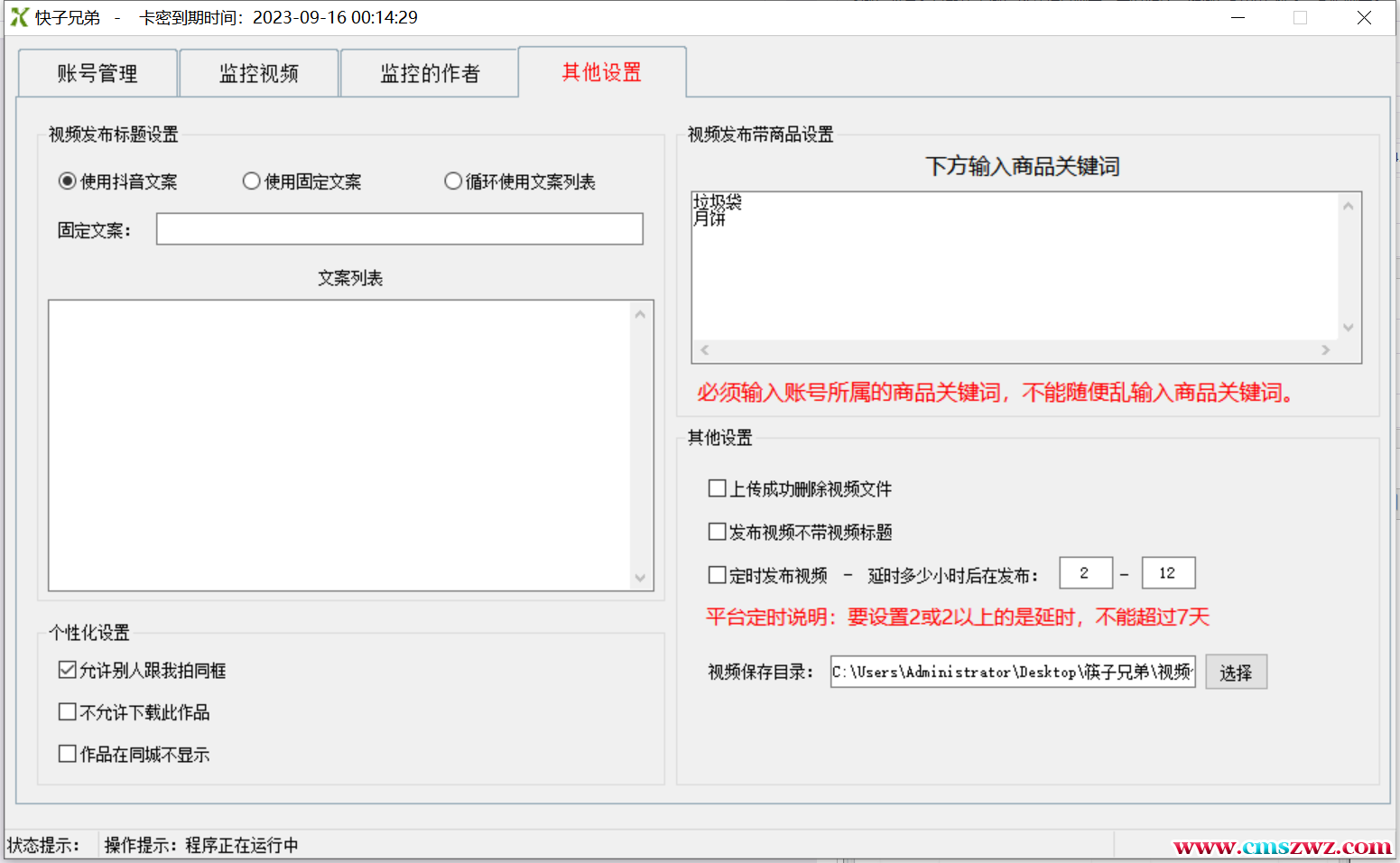 功能介绍:脚本自动监控抖音用户的作品,如果这个用户在抖音上发布了新作品,咱们的脚本自动同步搬运到快手,轻松过原创,打家劫舍搬运作品必备黑科技设备需求:电脑
