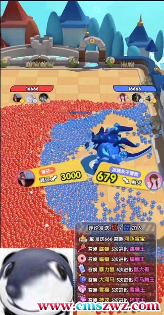 关于萌宠宠之战萌宠宠之战(简称:萌宠宠)是一款简单有趣的礼物互动小玩法,观众通过发送文字弹幕进行体验参与,通过点赞和礼物赠送召唤萌宠军团进行对战。不需拥有过人才艺,不需粉丝基础,一台电脑即可开播,简单易懂的规则和激烈的场面,能够很好的吸引观众进入直播间并参与礼物互动,使主播获得不菲的打赏收益!玩法规则观众输入“红”/“蓝”:加入一方阵营,加入后本单局无法更换阵营。[点赞]召唤河豚宝宝x3:基础军团
