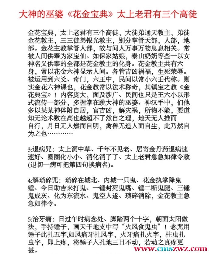 三、法术:用金花九宫香看风水,更让你如虎添翼,阴灵、怪病、收魂、还阴债等面面俱到。九支香分九宫,还上阴债,改变前世因果也就改变了今生的命运。定阴大法更奇,一摸病人手便如何阴灵来犯,来要什么,剪纸送还病立转好,金刚咒、陀罗尼咒、佛道两界秘传颂念大法,使你会获大福利得大果报。走阴过阴是金花教本大法,有“不会走阴不能按堂口之说”,是沟通人与阴性能量的法术,可知晓生死因果与故去的亲人交流,盖有丁星印的金花教主开光图,会让每个学员都能早成正果,获利扬名,六万多字,清晰打印,详细全面物有超值。