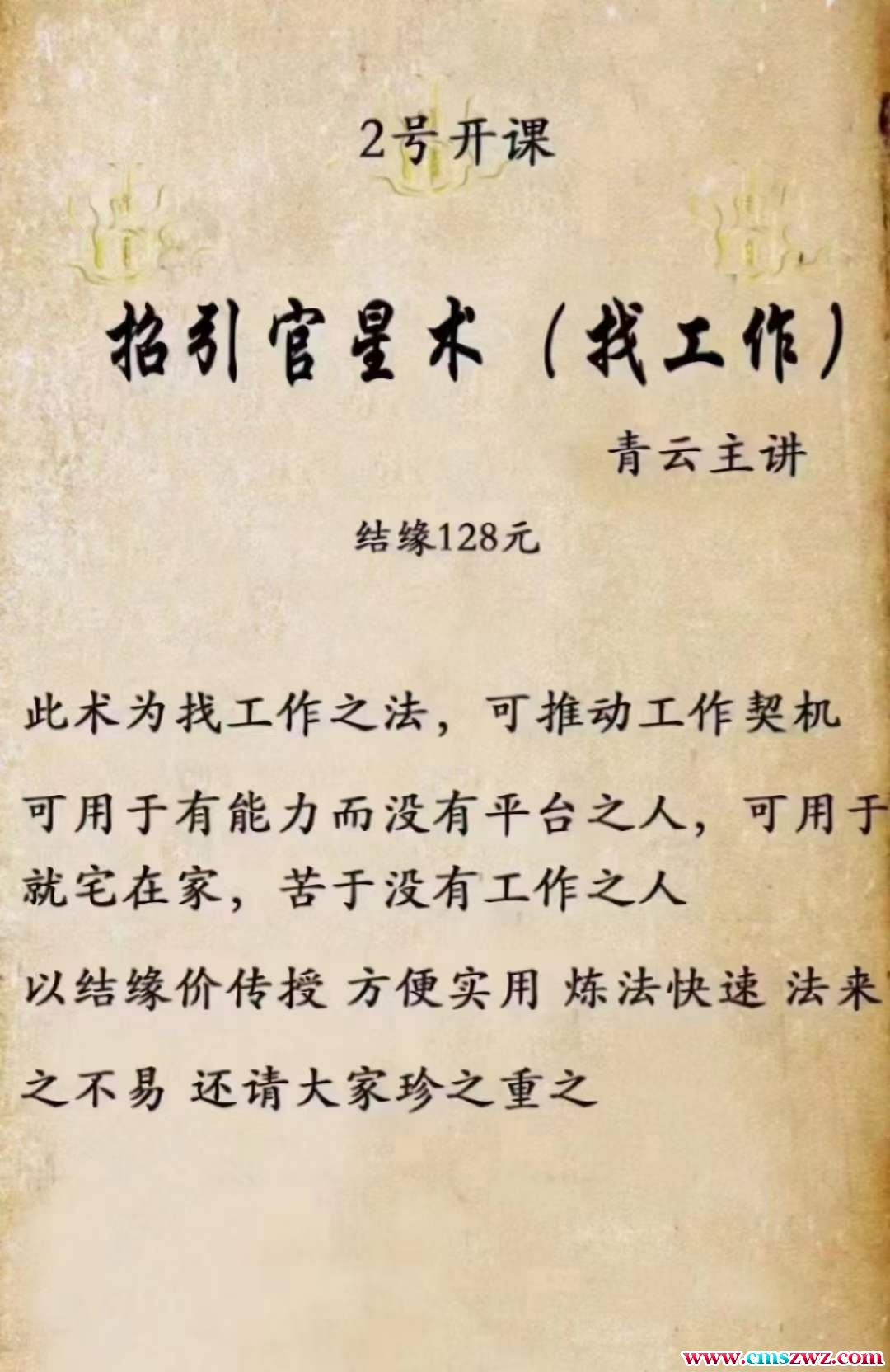 课程编号:D2211-42招引官星术(找工作)青云易学资料发百度网盘!!此术为找工作之fa,可推动工作契机,可用于有能力而没有平台之人,可用于就宅在家,苦于没有工作之人以结缘价传授 方便实用 炼法快速