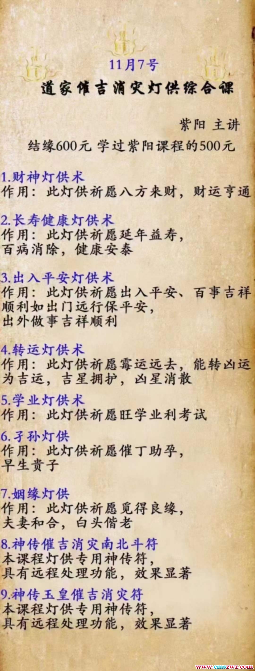 课程编号:D2212-35紫阳老师道家催消吉灾灯供综合课紫阳 主讲1.财灯神供术作用:此灯供愿祈八方来财,财运亨通2.长寿康健灯供术作用:此灯供祈延愿年益寿,百病消除,健安康泰3.出入平安