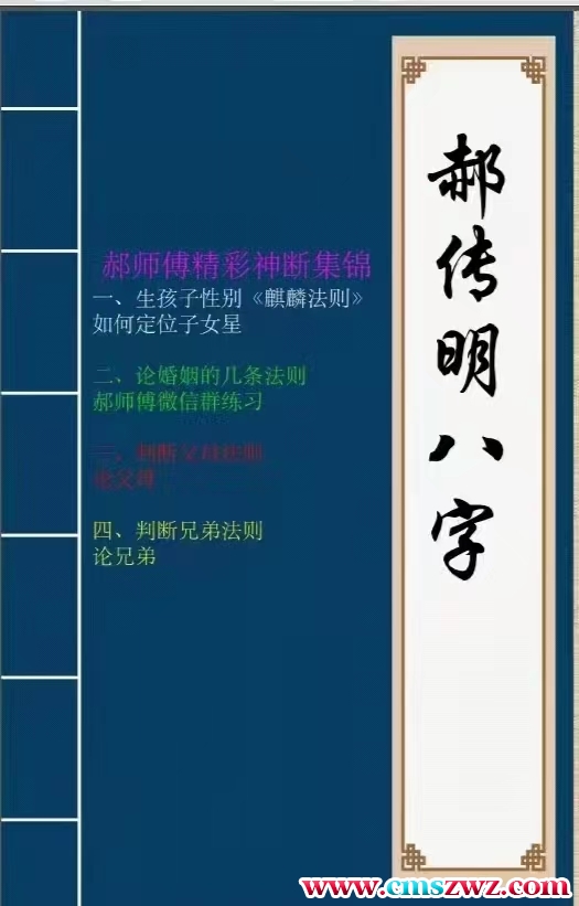课程编号:Y2210-39(盲派命理)郝传明东北盲派《实战:如何定位子女星、如何看夫妻感情、判断父母法则、判断兄弟法则、判断六亲法则》112页郝师傅精彩神断集锦一、生孩子性别《麒麟法则》如何定位子女星