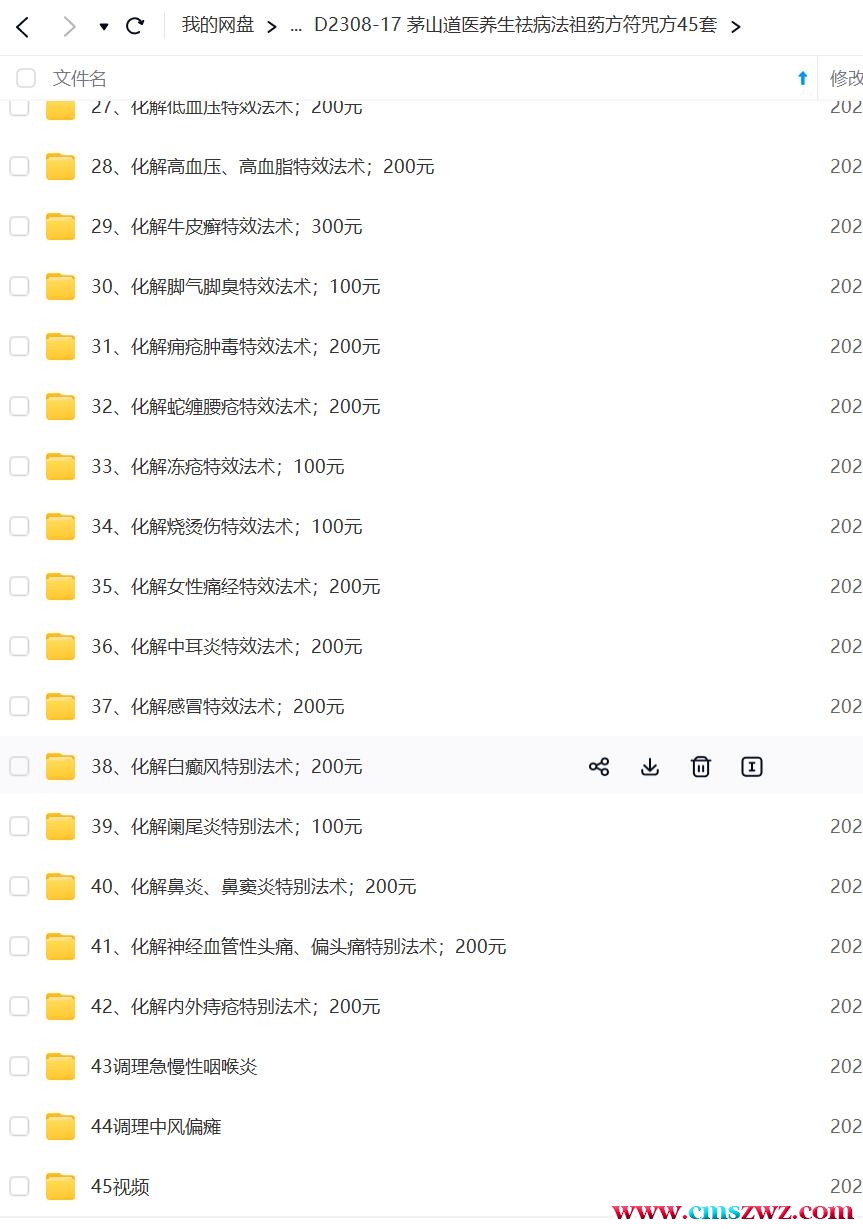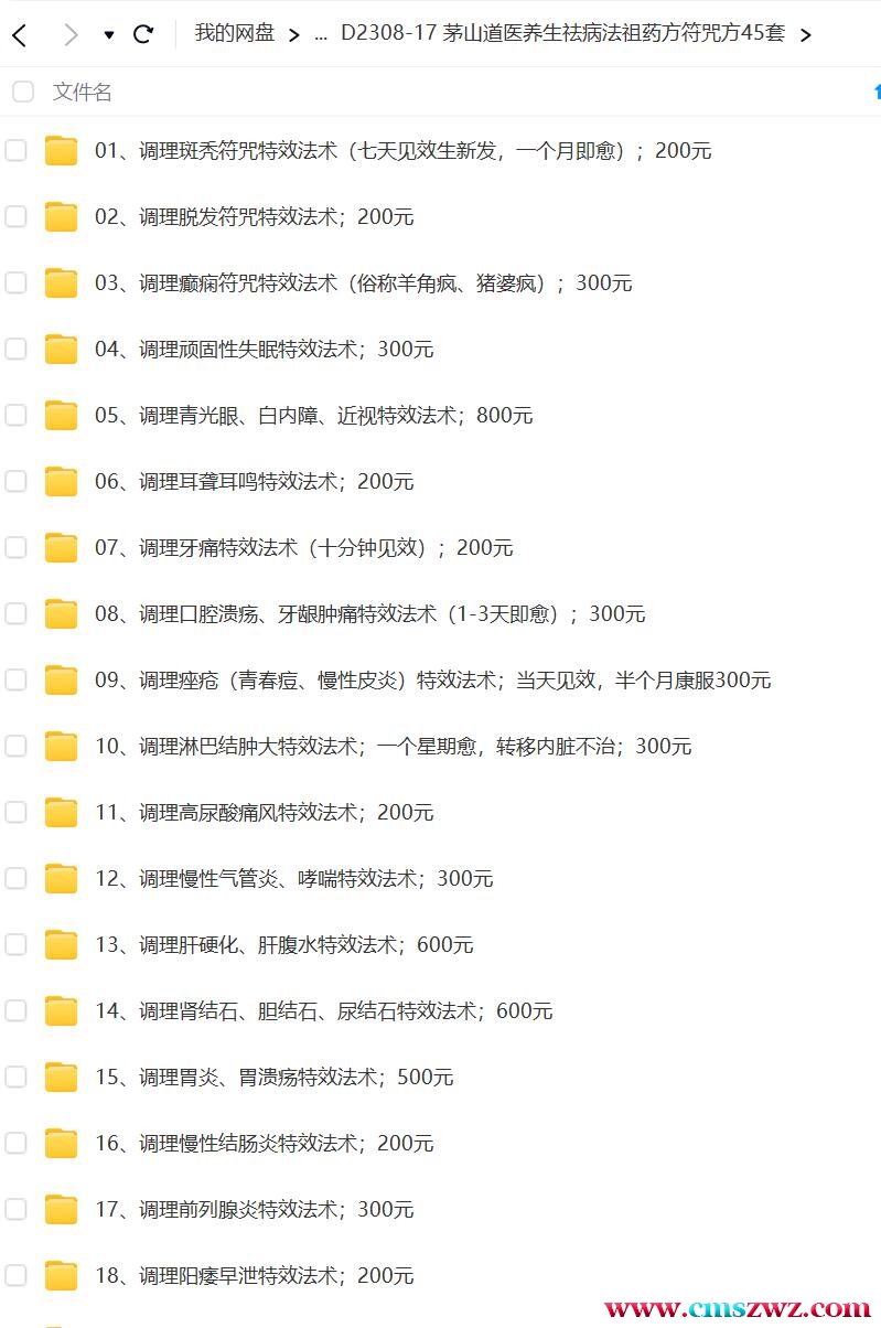 课程编号:D2308-17茅山道医养生祛病法祖(药方符咒方)45套。基本每个药方配一个符咒。具体包括调理脱发、调理顽固性失眠、调理蛇缠腰疮、调理慢性结肠炎、调理神经血管性头痛、调理牛皮藓、视频、调理女