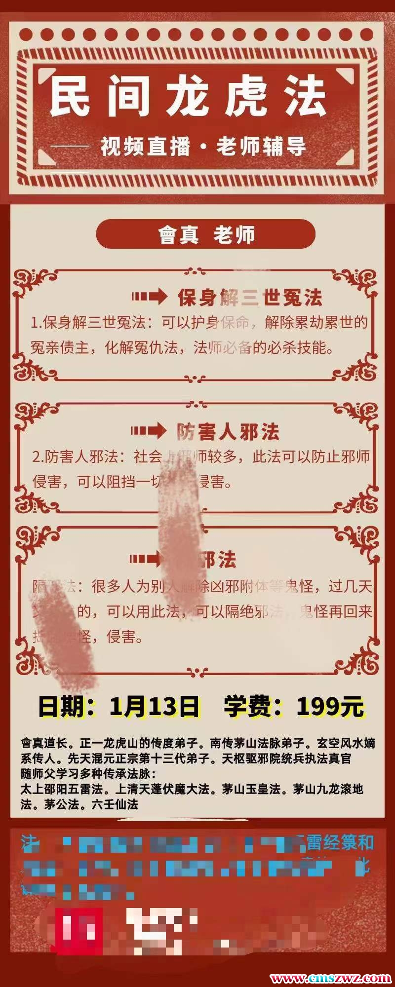 课程编号:D2311-31民间龙虎法段至灵会真老师讲解會真老师视频➕文档保身解三世冤法1.保身解三世冤法:可以护身保命,解除累劫累世的冤亲债主,化解冤仇法,法师必备的必杀技能。防害人邪法2.防害人邪法