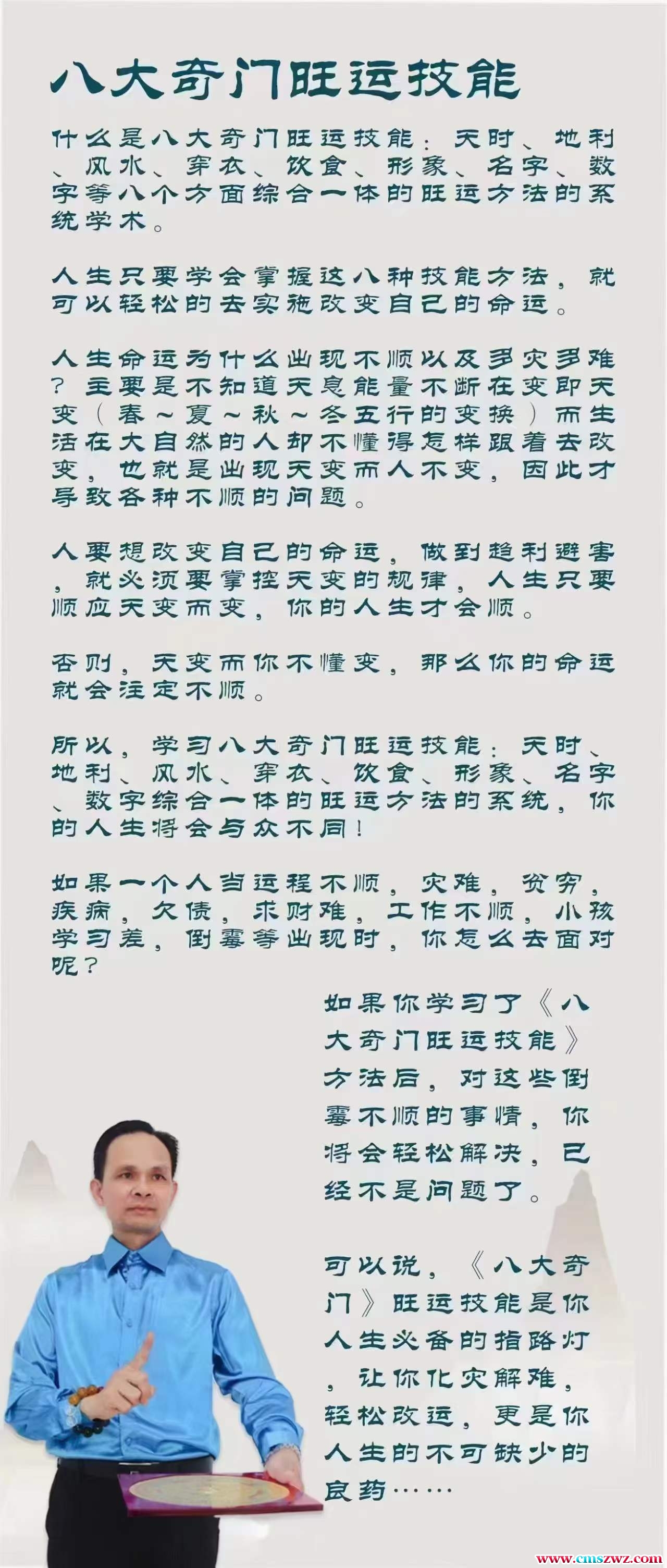 所以,学习八大奇门旺运技能:天时、地利、风水、穿衣、饮食、形象、名字数字综合一体的旺运方法的系统,你的人生将会与众不同!