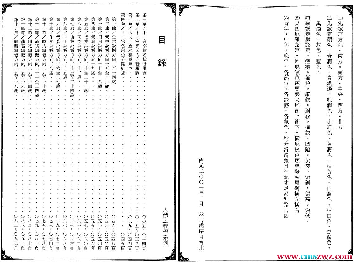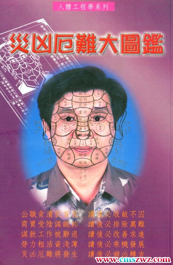 自面相男权宝鉴。面相女权宝鉴。相理观商机系列一。相理观商机系列二。出版后蒙先进之赞赏深受爱好初学者之喜爱。而续出版灾凶厄难大图鉴。企能造就社会大众且能钻研体会人生运程之吉凶。笔者将人体工程部位分开细述详图解说 读者只要细心钻研定能与日俱增。人体工程学是五术中之一术。也是博大精深之一门学问。人之鼓凶均能显现在五官十二宫面容上。春天喜青润。夏天喜红润。中央土喜黄润。秋天喜白润。冬天喜黑润。人之五行气色能顺季节行运。当之运程潦倒败业。面宫气色走势。疤痕走势。纵理斜纹走势。形貌缺乏气势。均能影响一个人之运程。笔者将人体工程学之多年概念经验累积整理成社日。为能造就初学者。关念相同爱好者之便。均以白话文论述编著。人之行运物质先知会自己。先相信智慧勤俭。行事风格有否偏离方向。有否道德关念。次之相信命理走运。人各有长短。眉清目秀才高八斗为长。厚发浓眉气促神昏为短。人总之先思量自己风格之气度风范。再衡量运程走势吉凶。