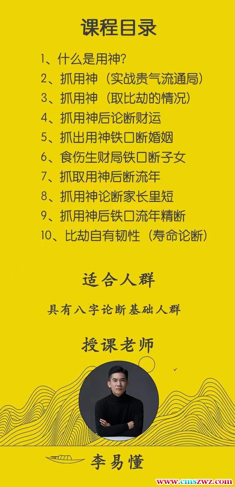 课程编号:Y2401-60最新引进:李易懂速取八字用神论10集课程目录1、什么是用神?2、抓用神(实战贵气流通局)3、抓用神(取比劫的情况)4、抓用神后论断财运5、抓出用神铁口断婚姻6、食伤生财局铁口