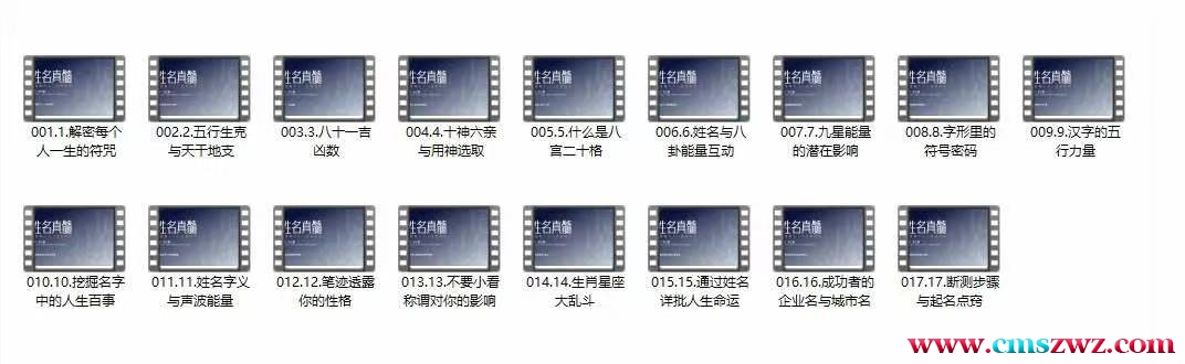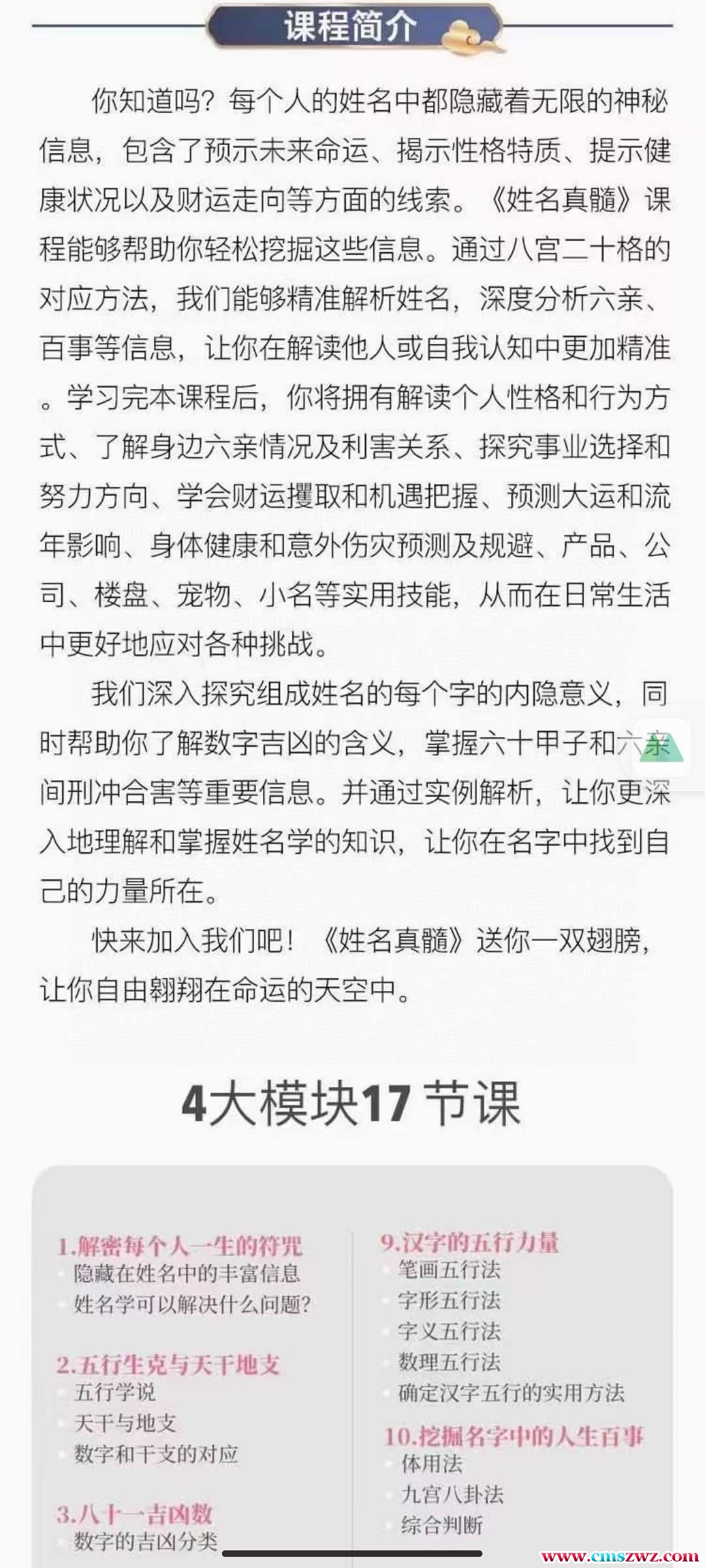 课程编号:Y2401-67(姓名学)石三喜·姓名真髓 视频17集 视频课程 感兴趣请私聊!01解密每个人一生的符咒02.五行生克与天干地支03.八十一吉凶数04.十神六亲与用神选取05什么是八宫二十格