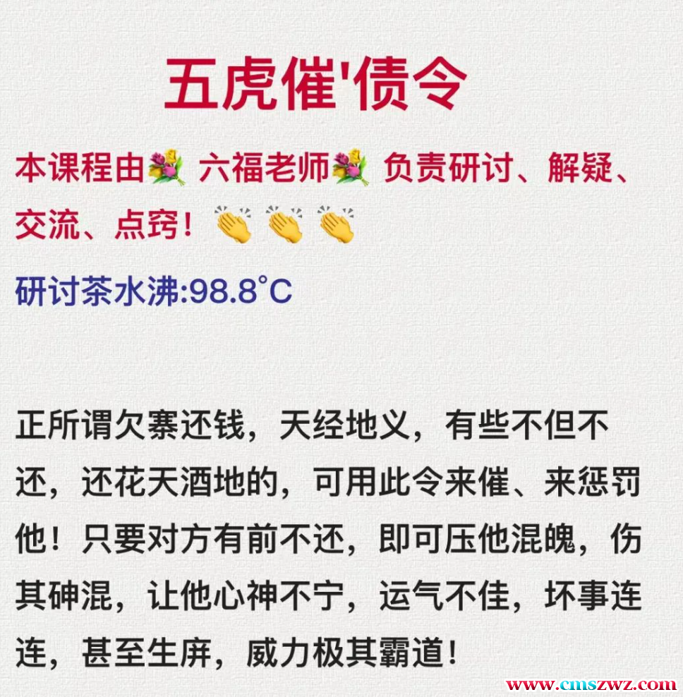 课程编号:Y2401-129五虎催债令本课程由 六福老师义 负责研讨、解疑交流、点窍!正所谓欠寨还钱,天经地义,有些不但不还,还花天酒地的,可用此令来催、来惩罚他!只要对方有前不还,即可压他混魄,伤其