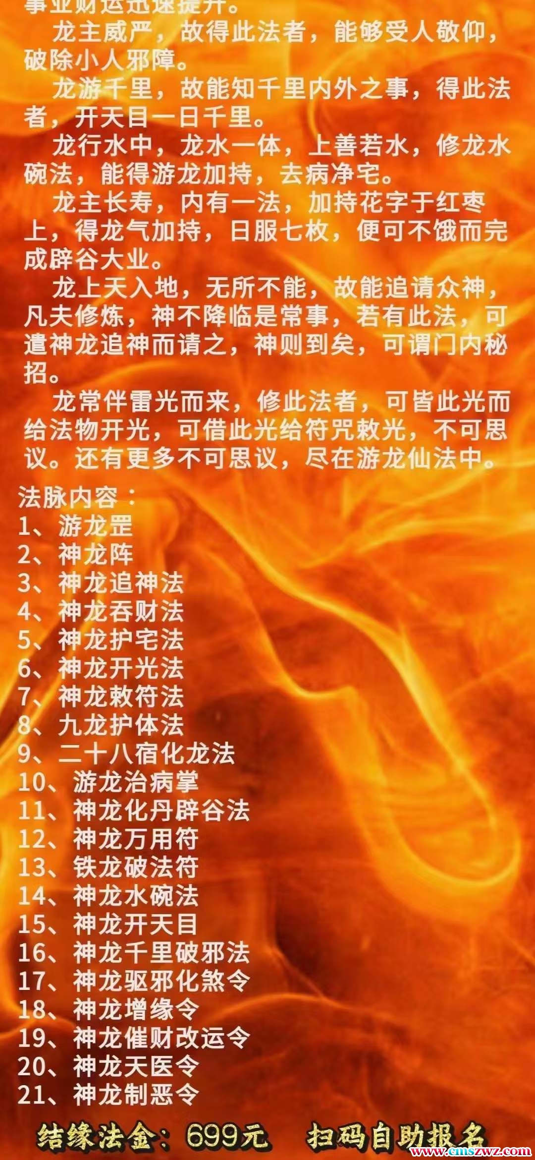 龙常伴雷光而来,修此法者,可皆此光而给法物开光,可借此光给符咒敕光,不可思议。还有更多不可思议,尽在游龙仙法中法脉内容: