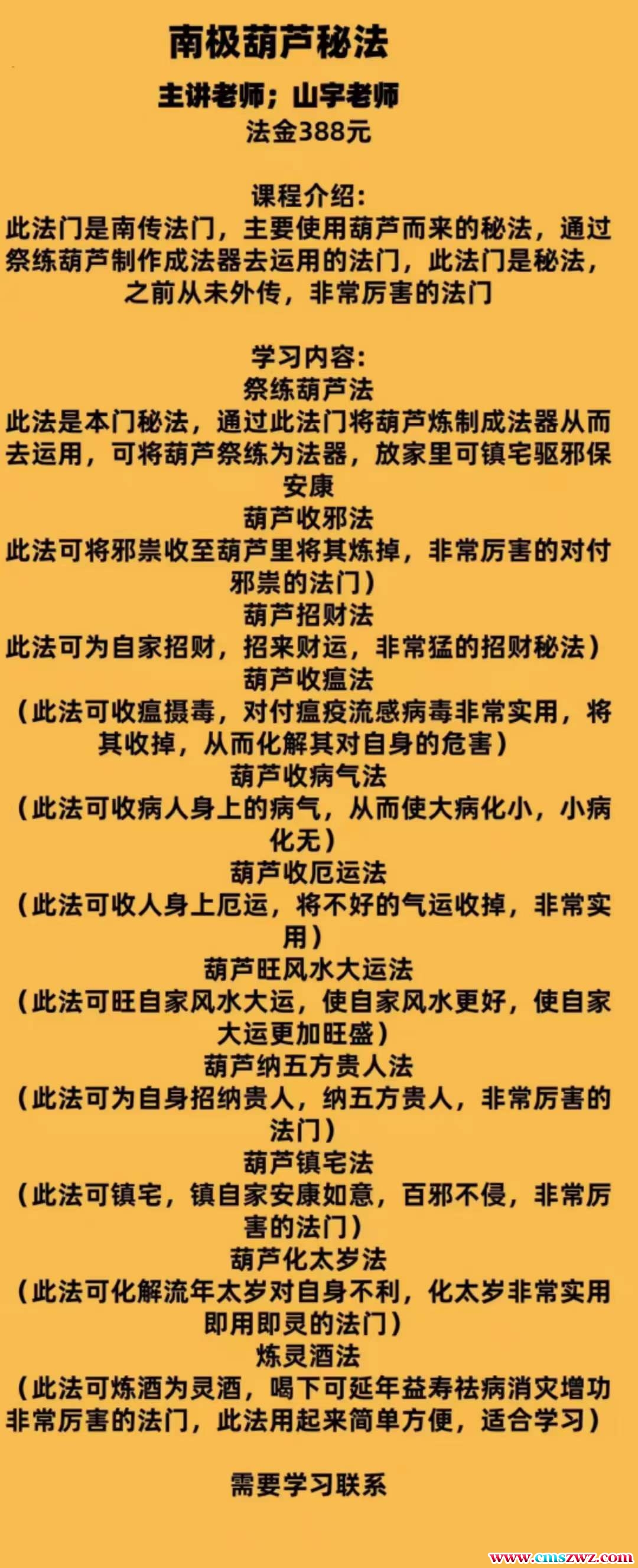 课程编号:Y2402-09山宇老师南极葫芦秘法课程介绍:此法门是南传法门,主要使用葫芦而来的秘法,通过祭练葫芦制作成法器去运用的法门,此法门是秘法,之前从未外传,非常厉害的法门学习内容:祭练葫芦法(此