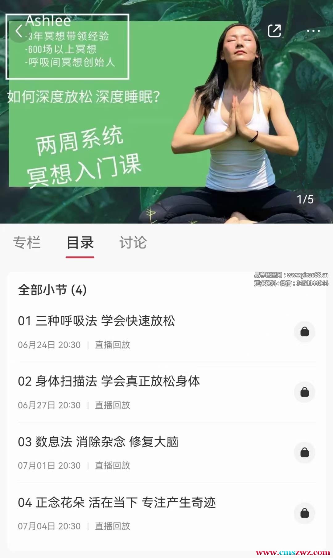 课程编号:X2401-13三种呼吸法 学会快速放松.mp4身体扫描法 学会真正放松身体.mp4数息法 消除杂念 修复大脑.mp4正念花朵 活在当下 专注产生奇迹.mp4