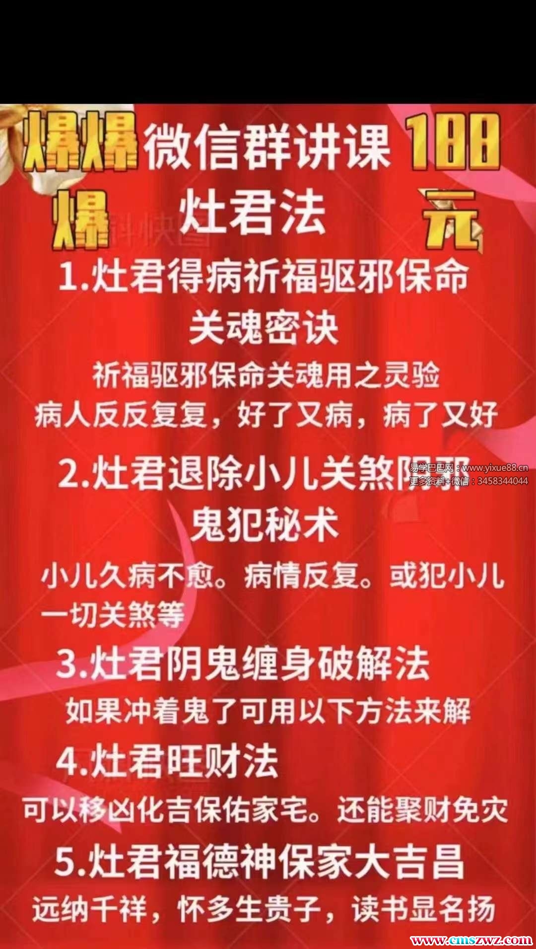 课程编号:Y2403-03最新引进宇安——灶君法(增驱邪护身小法)1.灶君得病祈福驱邪保命关魂密诀祈福驱邪保命关魂用之灵验病人反反复复,好了又病,病了又好2.灶君退除小儿关煞阴邪鬼犯秘术小儿久病不愈。