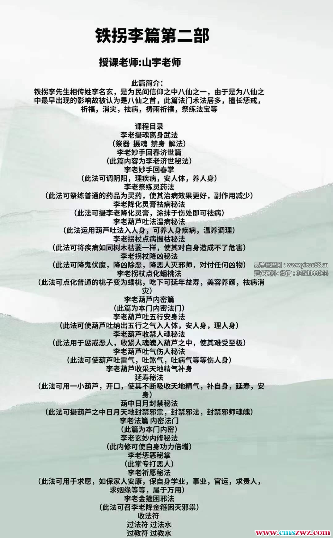 铁拐李先生相传姓李名玄,是为民间信仰之中八仙之一,由于是为八仙之中最早出现的影响故被认为是八仙之首,此篇法门术法居多,擅长惩戒,祈福,消灾,祛病,祷雨祈穰,祭练法宝等