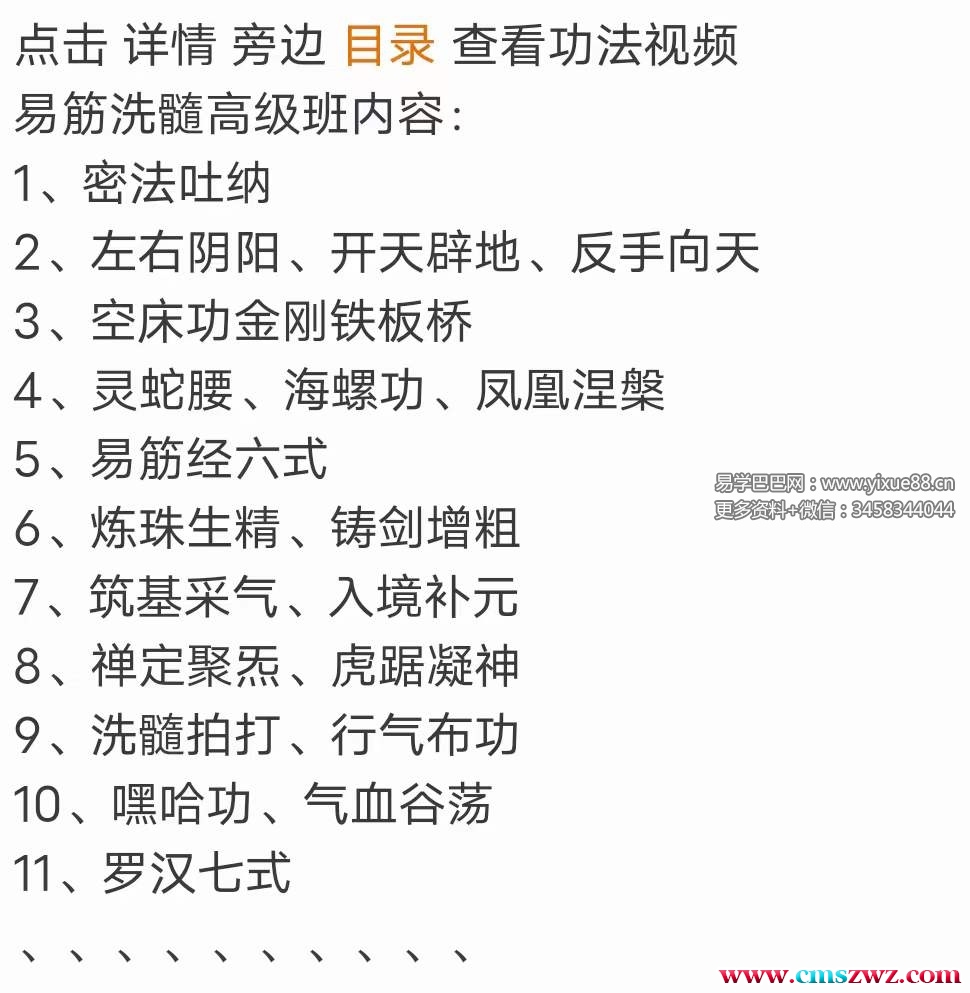 课程编号:Y2403-91练习易筋洗髓内功的方法,可以提升战斗力,但也提升内功。易筋洗髓高级班:1、密法吐纳2、左右阴阳、开天辟地、反手向天3、空床功金刚铁板桥4、灵蛇腰、海螺功、凤凰涅槃5、易筋经六