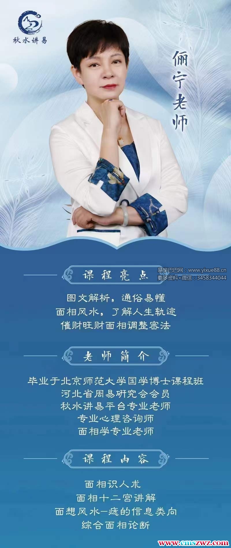 课程编号:Y2403-141最新引进:俪宁老师面相学识人术毕业于北京师范大学国学博士课程班河北省周易研究会会员秋水讲易平台专业老师专业心理咨询师面相学专业老师
