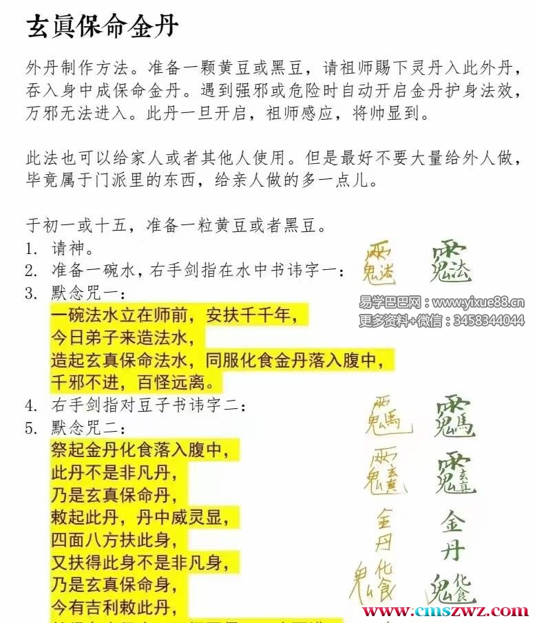 行什么法办什么事,即用即灵,所到之处敕令必行。)二、玄真保命金丹(外丹制作方法准备一颗黄豆或黑豆请祖师赐下灵丹入此外丹,吞入身中成保命金丹,遇到强邪或危险时自动开启金丹护身法效,万邪无法进入,此丹一旦开启祖师感应,将帅显到。此法也可以给家人或者其他