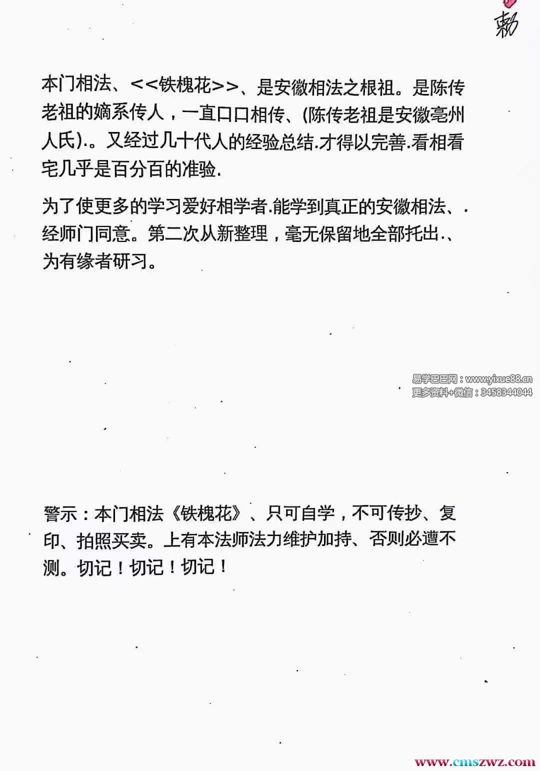 课程编号:Y2404-107正宗安徽相法铁槐花pdf 上下册,上册96页,下册94页本相门法<<铁槐花>>(上两下册,图文电资子料)铁槐是花安徽相之法根祖。是陈传祖老的嫡系传人
