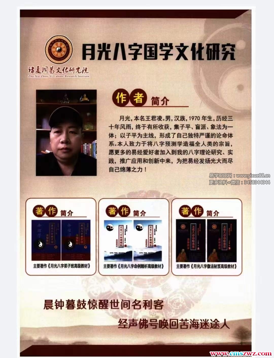 年生,历经三十年风雨,终于有所收获,集子平、盲派、象法为一体;以子平为主线,形成了自己独特严谨的论命体系。本人致力于将八字预测学造福全人类的宗旨,愿更多的易经爱好者加入到八字理论研究、实践,推广应用和创新中来,为把易经发扬光大而尽自己绵薄之力!