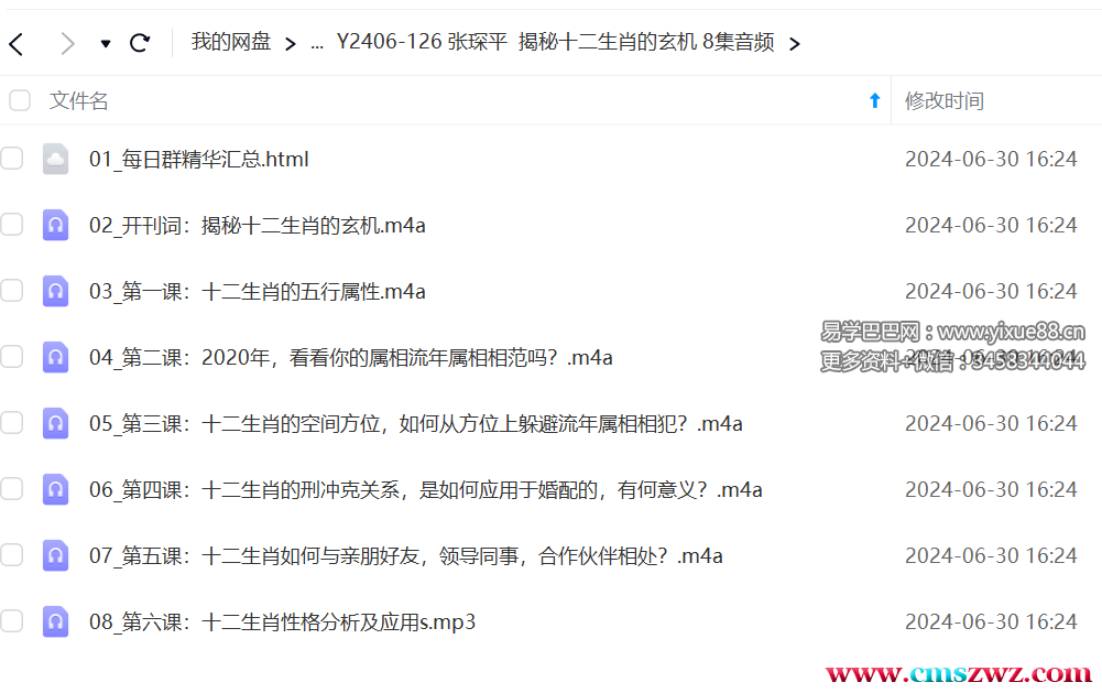 课程编号:Y2406-12601 每日群精华汇总.html02 开刊词:揭秘十二生肖的玄机.m4a03 第一课:十二生肖的五行属性.m4a04 第二课:2020年,看看你的属相流年属相相范吗?.m4a